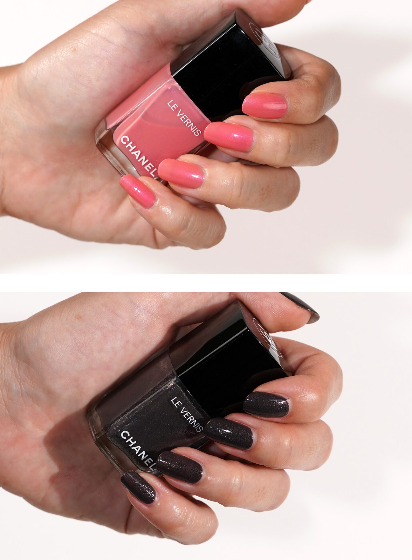 Last is a look at the two new spring nail polishes. 361 Pionniere is a pretty warm pink shimmer. This one pulls sheer so three coats are required for full coverage. 363 Utopiste is a shimmering dark black with multi-colored sparkles mixed in, but on my nails the shimmer is subtle and it looks more like a black-grey sparkle on the nails.